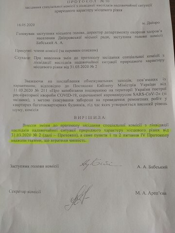 Такое решение городских властей доставило массу неудобств днепрянам. Ведь многие уже начали ремонтировать свои дома еще до того, как в мэрии приняли неожиданное решение. Люди уже ободрали обои и начали сносить пол и стены, то-то менял батареи и проводку и все работы пришлось остановить. Жители Днепра были вынуждены ждать два месяца разрешения на продолжение работ и весь карантин жить в хаосе.