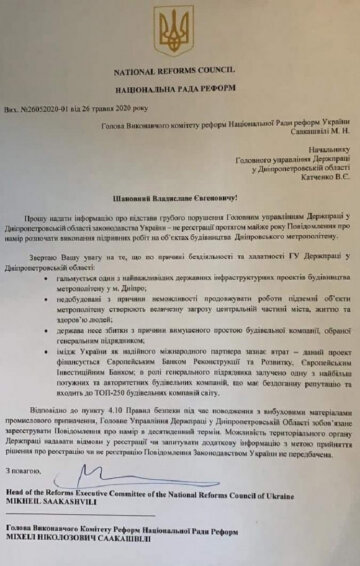 В документе подчеркивается, что масштабный государственный проект по достройке метро в Днепре, который финансируется за счет средств международных финансовых организаций, оказался под угрозой срыва. Из-за этого Украина несет убытки из-за простоя подрядной строительной компании. Страдает имидж страны в глазах зарубежных партнеров. Более того, в письме говорится, что недостроенные подземные объекты метрополитена создают серьезную угрозу для зданий и жителей центра Днепра.