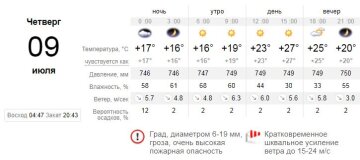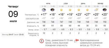 Ветер северо-западный. Синоптики предупреждают о кратковременном шквальном усиление ветра до 15-24 метров в секунду. Кроме того, в этот день возможен град, диаметром 6-19 мм и гроза. Также сохраняется очень высокая пожарная опасность.