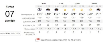 Но 7 октября днепрянам нужно покрепче придерживать шляпы. В городе будет очень ветрено, но тепло и без осадков. Кроме того, не забывайте держаться подальше от деревьев. Любое из них может грохнуться, и хорошо, если не на машину и не на голову.