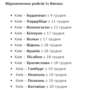 В декабре из Киева запланировано более десяти рейсов. Ближайший произойдет в пятницу, 11 декабря в Пардубице. Далее 13 будет рейс в Копенгаген.