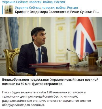 Сунак заявив, що Лондон вже найближчим часом передасть Україні 120 спеціальних зенітних гармат та радіолокаційних станцій. Крім того, українські захисники отримають спеціальне зимове обладнання, а загальна сума гуманітарної допомоги, яку надішле Великобританія, становитиме 16 мільйонів фунтів.