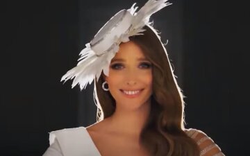 Подовжений піджак застібується не на ґудзик, а на оригінальну застібку на боці. Тканина підкреслила фігуру Каті, від чого помітно, що в талії ведуча стала трохи ширше. На лацкані ще додане біле, легеньке пір'ячко.