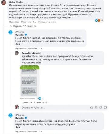 Співробітники компанії вибачилися за такі проблеми. Також в мобільному операторі зазначили, що фахівці працюють над ви-рішенням проблеми. Трохи пізніше в компанії пояснили, що булі деякі проблеми з обладнанням. Що стосується всіх абонентів, які понесли збитки, то для них проведуть перетарифікацію.