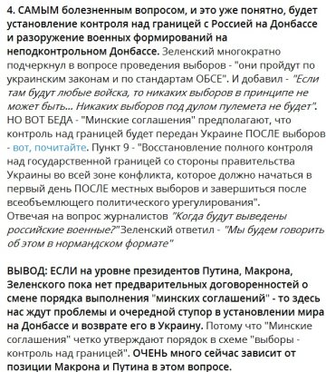 В-третьих, Зеленский настаивает на том, что Украина не капитулирует. Зеленский заявил, что будет разработан новый закон об особом статусе Донбасса, в него будет включена "формула Штайнмайера". Старый закон истекает 31 декабря и в реальности он так и не заработал. Он должен иметь