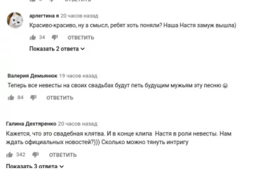 «Настя, вы с Алексеем написали отличную песню!!! Отличную!!!! А этот клип, по моему мнению, лучший из того, что вы снимали раньше», «Боже, какая красивая женщина. Королева!», «Кажется, что это свадебная клятва. И в конце клипа Настя в роли невесты. Нам ждать официальных новостей?))) Сколько можно тянуть интригу», «Теперь все невесты на своих свадьбах будут петь будущим мужьям эту песню», «Красиво-красиво, ну а смысл, ребят хоть поняли? Наша Настя замуж вышла)», — пишут в комментариях.