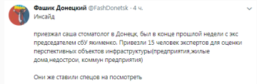 «Приезжал Саша стоматолог (так называют сына Януковича — ред.) в Донецк, был в конце прошлой недели с экс-председателем СБУ Якименко. Привезли 15 человек экспертов для оценки перспективных объектов инфраструктуры (предприятия, жилые дома, недострои, коммунальные предприятия)», — написал блогер.