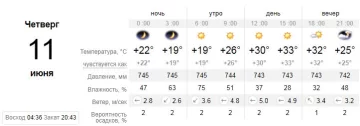 С утра 11 июня градусники на улице покажут 19 плюс. Ближе к обеду воздух на улице нагреется до 26 градусов тепла. Жара начнется с обеда и до вечера. Синоптики прогнозируют +30°С - +33°С на целый день. С наступлением вечера температура сбавит обороты всего на градус - +32°С. А ближе к ночи можно будет отдохнуть от жары, ночь будет комфортной - 25 градусов тепла.