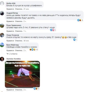 Варто зазначити, що українці стали активно реагувати на таку подію. В коментарях громадяни стали писати про свою думку. Так, деякі вважають, що для того, щоб люди дійсно припинили ображати інших в мережі, треба підійняти штраф – наприклад, до 3 тисяч гривень. Однак знайшлися й ті, хто вважає, що навіть такий штраф можна віднести до початку підвищеної цензури в інтернеті. Крім того, деякі просто пожартували, що можна було б просто після образи скинути гроші на картку.
