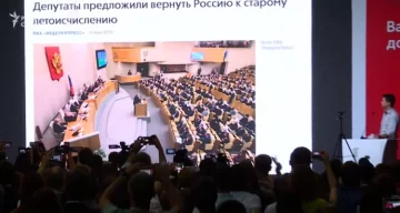 После этого Зеленский показал слайд с новостью «Депутаты предложили вернуть Россию к старому летоисчислению» и сказал, что такие «чиновники могут к такому привести».