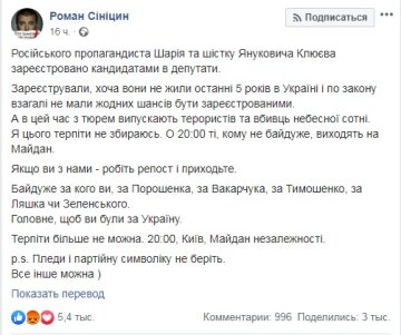 "Зарегистрировали, хотя они не жили последние 5 лет в Украине и по закону вообще не имели никаких шансов быть зарегистрированными. А в это время из тюрем выпускают террористов и убийц Небесной сотни. Я этого терпеть не собираюсь. В 20:00 те, кому не безразлично, выходят на Майдан ", - написал Синицын.